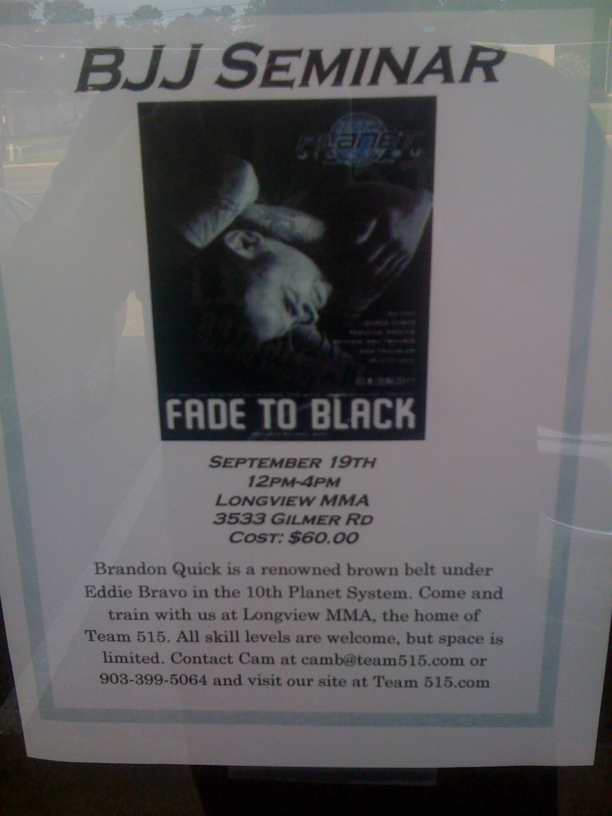 Hundreds of these flyers were put up at a texas tourney last weekend promoting Brandon’s seminar. A friend of Eddie’s in Texas sent over the pic. For those who don’t know, Brandon Was relieved of his 10th Planet association when it came to light he was in fact a fraudulent brown belt and a liar.