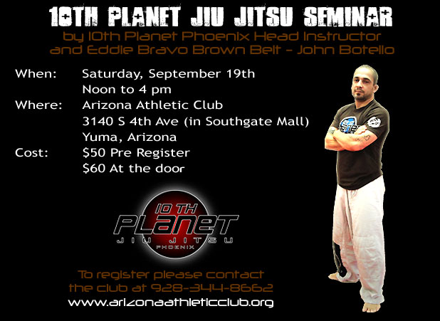 August 30th, 2009 In Seminars | Comments Off on 10th Planet Seminar, Sept. 19 Yuma AZCongrats To 10th Planet Stand Out, Sean “Double Bagger” Bollinger